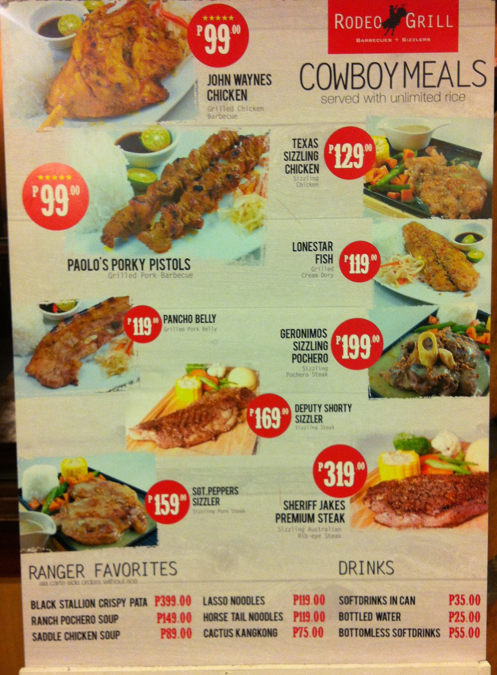 Rodeo Grill has just been opened for a week now. It's no surprise to see the new restaurant filled with people. If you love steak and grilled meals, Rodeo Grill is where you should be. Best sellers include Sgt. Peppers Sizzlers, Geronimo's Sizzling Pochero, and Sheriff Jake's Premium Steak. My personal favorite is Geronimo's Sizzling Pochero. I love the creaminess of the sauce and how it melts in my tongue. The meals are affordable too. They are just the right price I'd pay for good food.