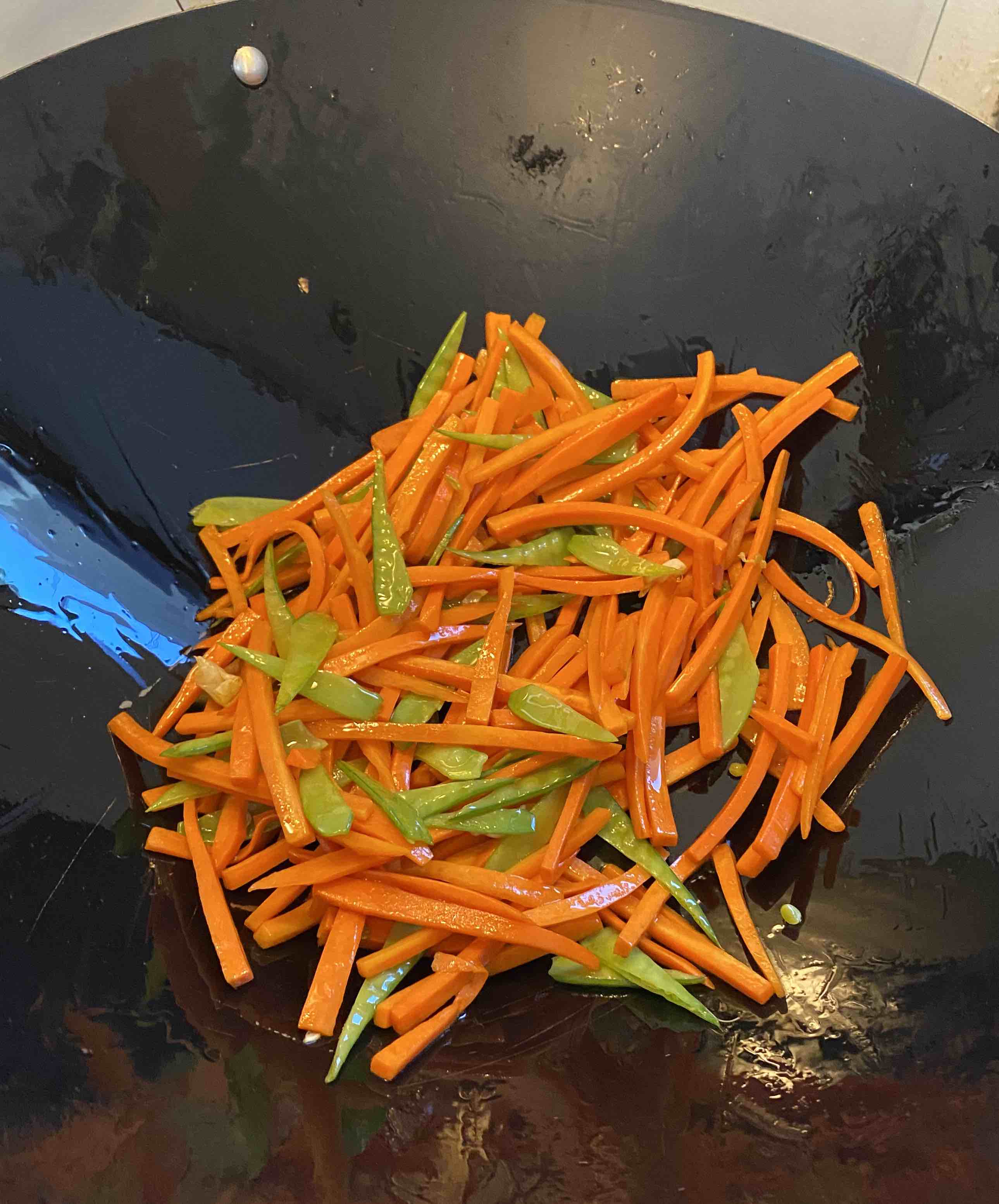 2. Oil on wok, put in carrots and beans. When slightly cooked, take out and set aside.