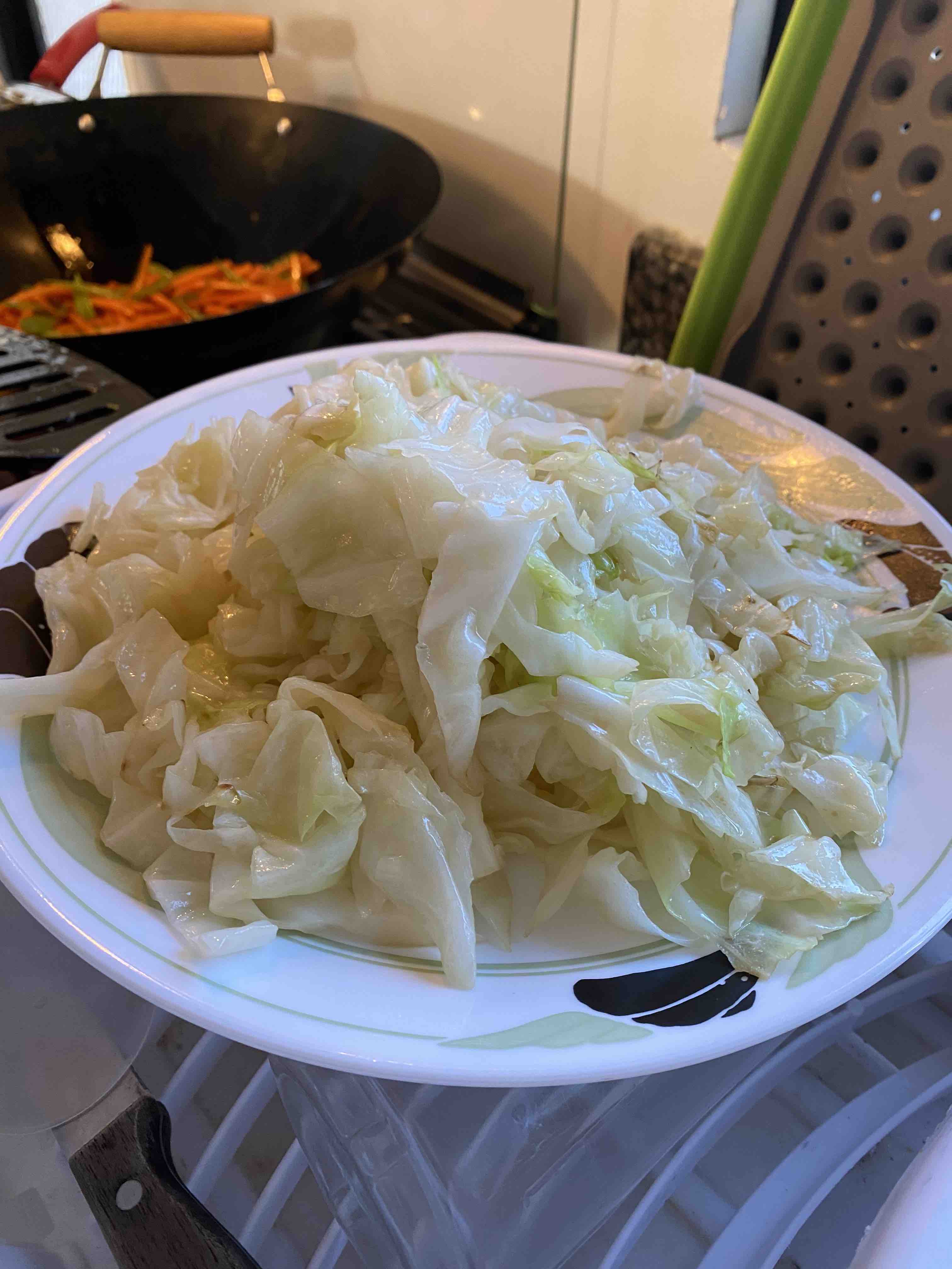 1. Oil on wok. Put in cabbage. On slightly cooked, take out and set aside